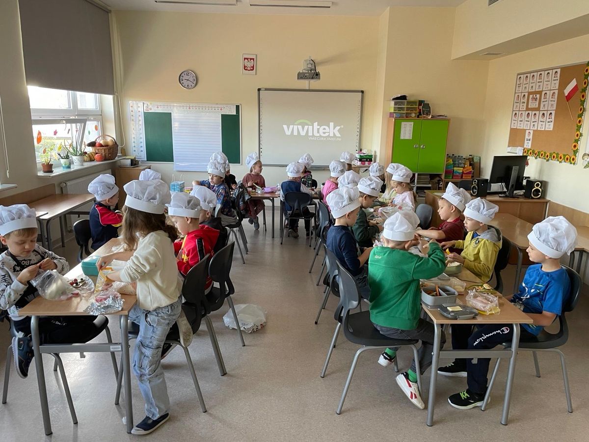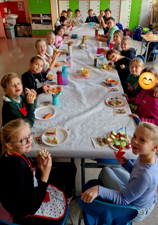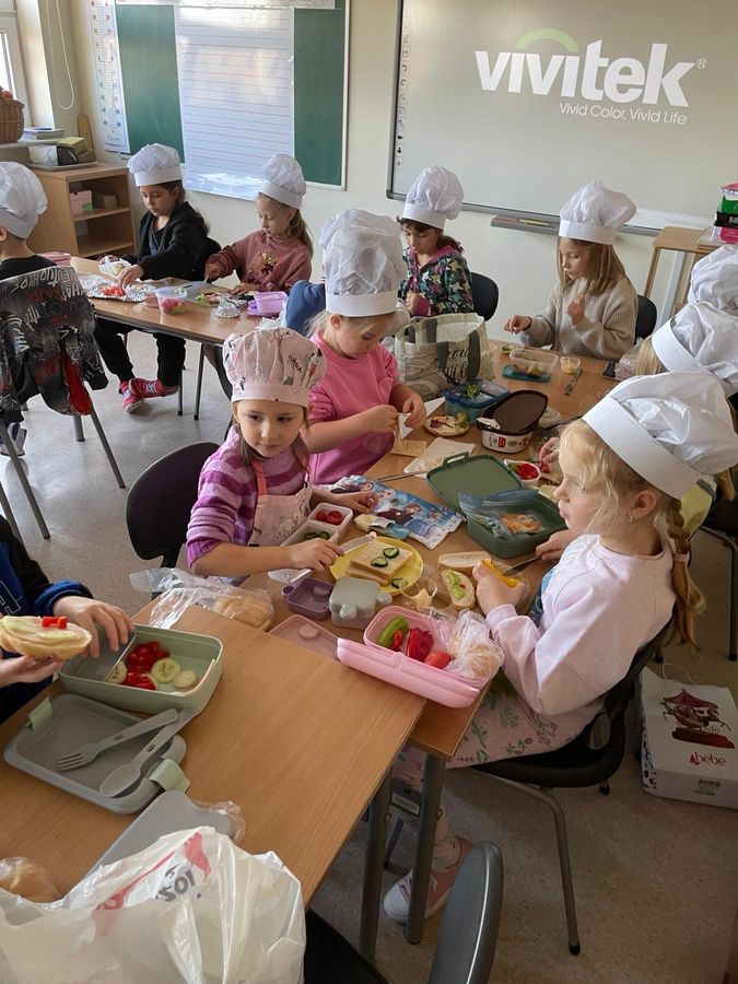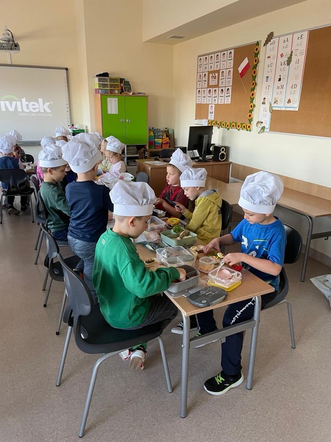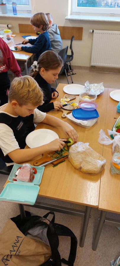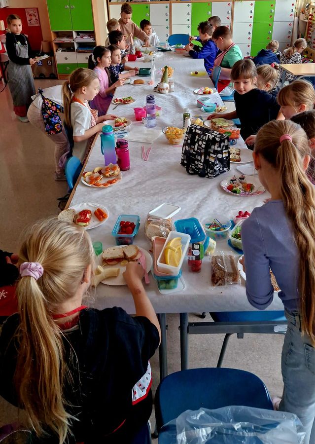 🥑 Największą atrakcją były warsztaty kulinarne, podczas których uczniowie samodzielnie przygotowywali swoje zdrowe śniadania. Powstały pełnoziarniste, kolorowe kanapki, owocowe kompozycje i pyszne, pożywne przekąski 🥪🍓. Dzieci pracowały z ogromnym zaangażowaniem, wykazując się kreatywnością i świetnym humorem, a wspólna degustacja była radosnym podsumowaniem całego przedsięwzięcia 😊🍽️.