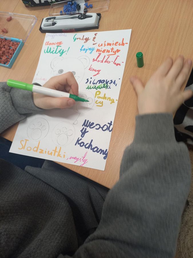 Następnie dzieci miały za zadanie dopisać jak najwięcej przymiotników opisujących swojego misia – dzięki temu powstały ciekawe, pełne emocji i pomysłowości opisy.