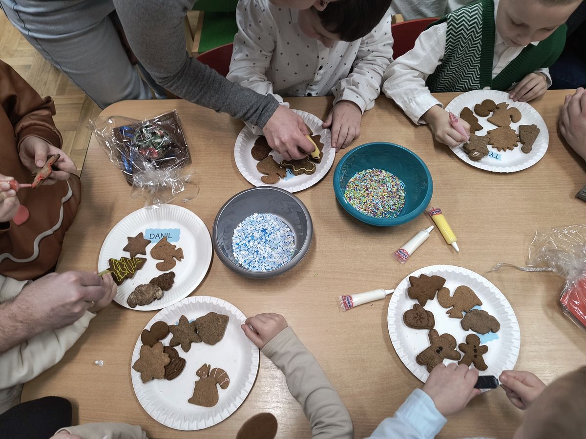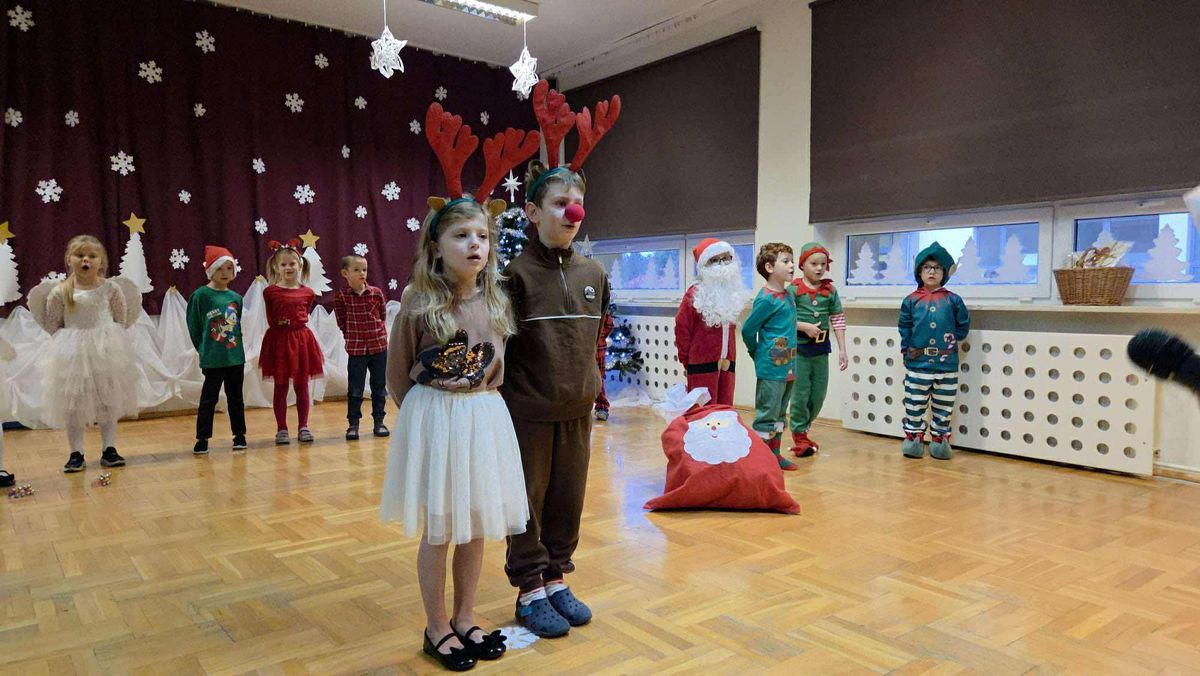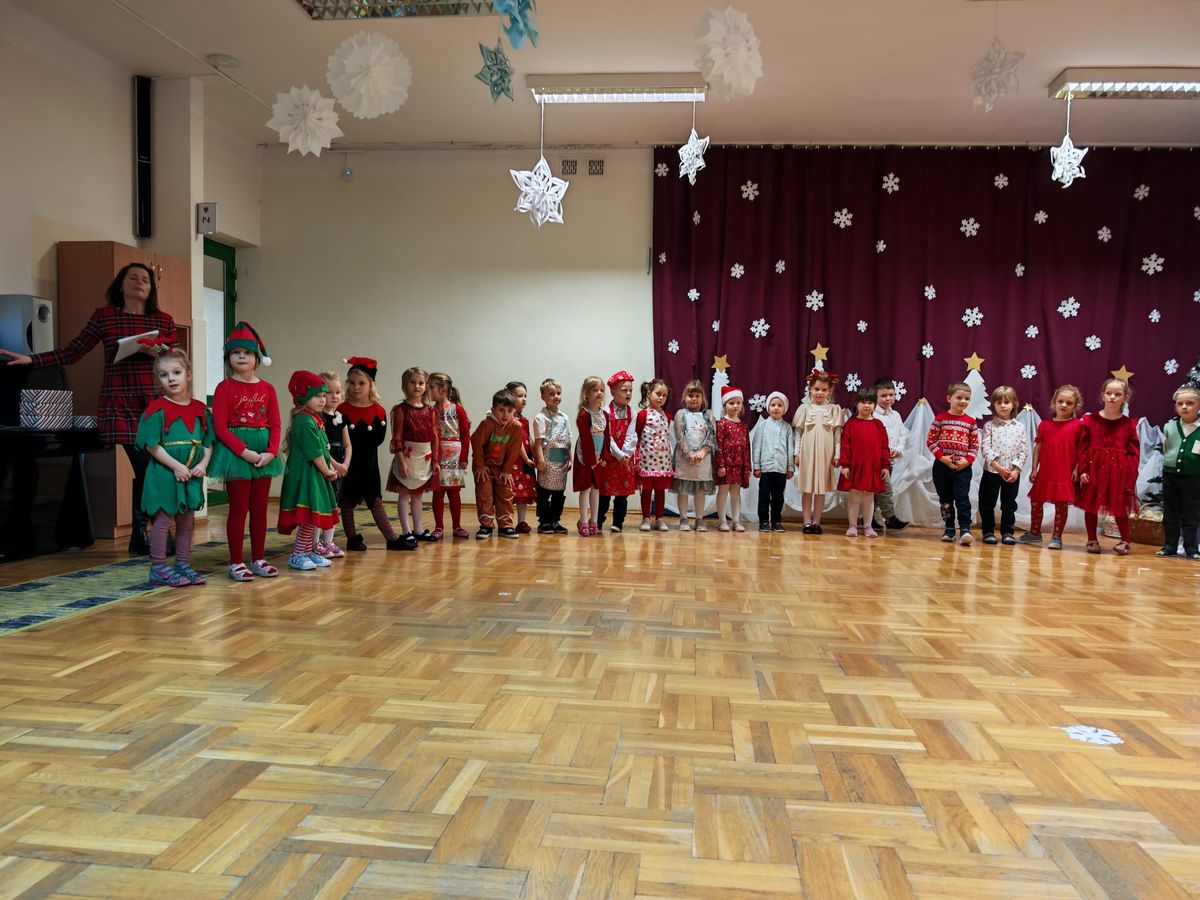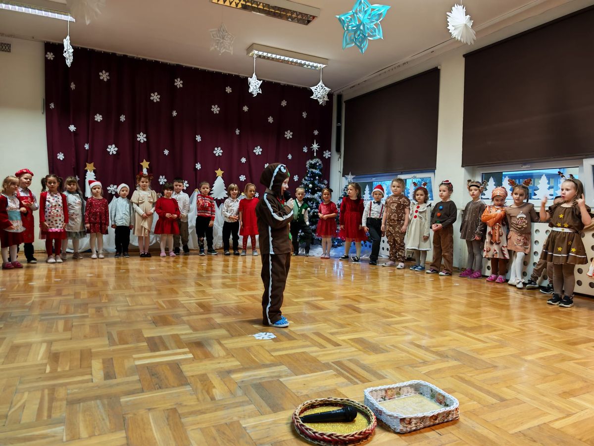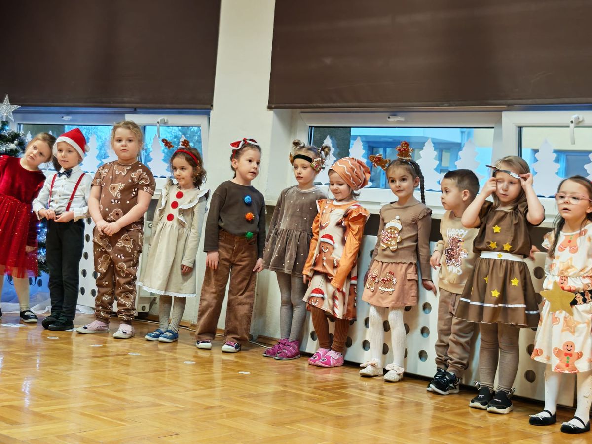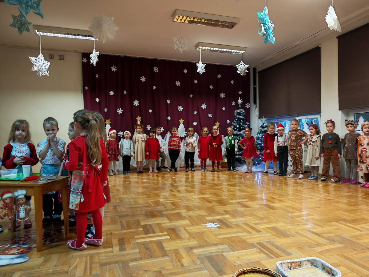 Mali artyści wcielili się w role wesołych elfów, pachnących pierników, aniołów oraz pomocników świątecznych. Kolorowe stroje, radosne piosenki i zimowe inscenizacje wywołały wiele uśmiechów i wzruszeń wśród zgromadzonych gości. Świąteczny nastrój towarzyszył najstarszym przedszkolakom także podczas wspólnego poczęstunku z rodzicami, w sali przy pięknie ubranej choince. Dzieci z grup Żabek i Motylków, zaprosiły rodziców do wspólnego dekorowania pachnących pierniczków.