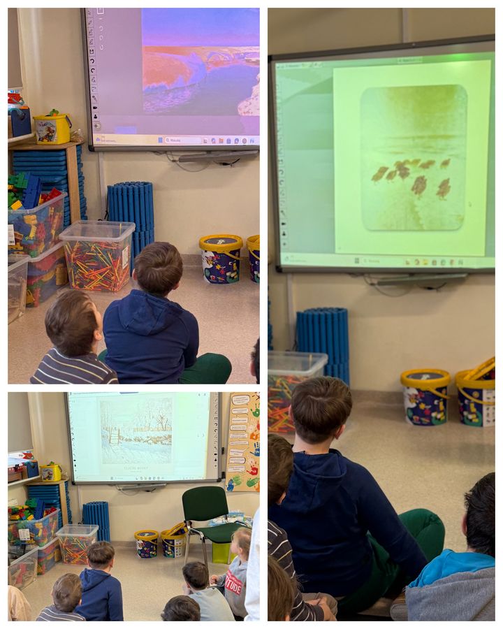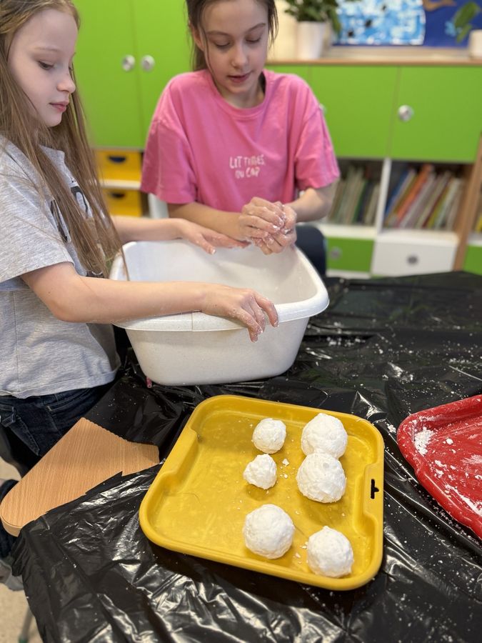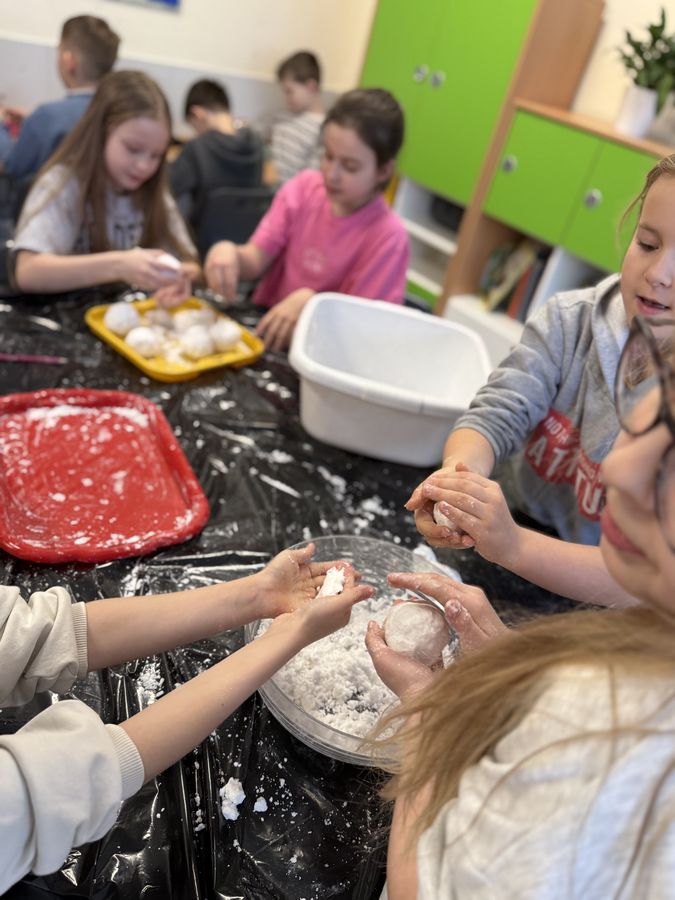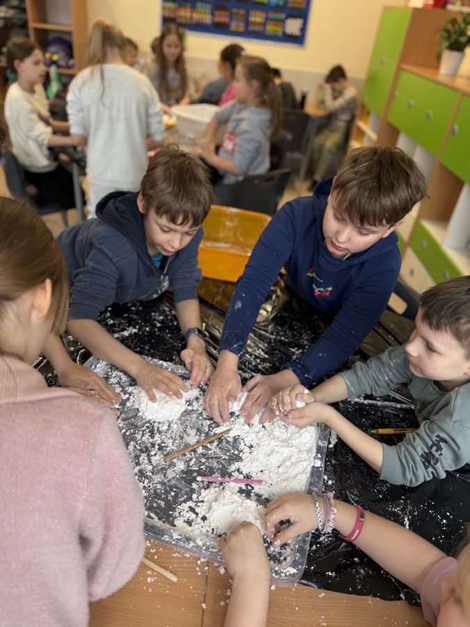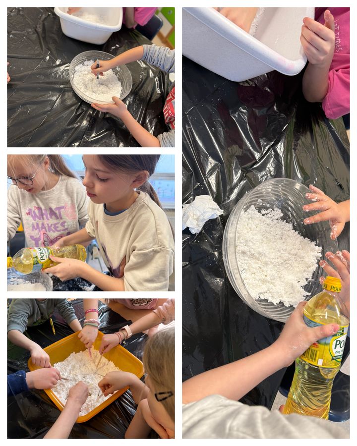 ❄️ Poznawali zimowe pejzaże w malarstwie – dzieła Józefa Chełmońskiego oraz Juliana Fałata – a następnie wspólnie przygotowali sztuczny śnieg z mąki ziemniaczanej, oleju i wody. Z powstałej masy tworzyli zimowe krajobrazy, bałwanki i zaspy.